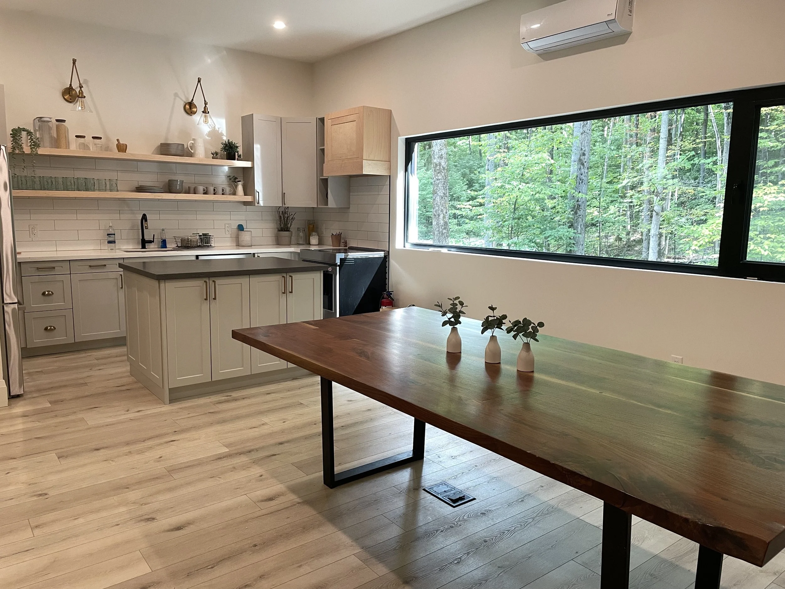 Nestled deep in the woods on 43 acres of mature forest in Horseshoe Valley, the modern barn-like studio houses over 3,200 sq ft of space to serve & surpass your needs. Separate from the barn studio is a 750 sq ft structure called our “Forest Plank”. The name rings true, as the plank is equipped with full bug screens, towering ceilings, and breathtaking views/forest sounds – all while being literally outside in the woods.